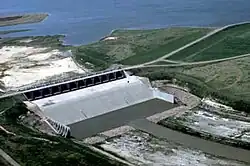 Glen Elder Dam is an earth-fill embankment dam with a structural height of 142 feet (43 m) tall and length of 15,275 feet (4,656 m).[6] At its crest, the dam has an elevation of 1,500 feet (460 m).[13] A spillway structure controlled by twelve 50-foot radial gates is located at the south end of the dam. It empties into a channel that joins the Solomon River approximately one mile to the east. A separate outlet works structure at the north end of the dam manages outflow into the river itself.[6]