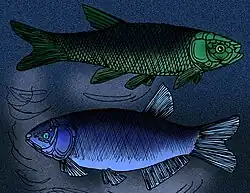 The Wadeichthys species was the second smallest of the five extinct fish found at Koonwarra.[2] These five families of extinct fish known from the Koonwarra fossil bed include Ceratodontidae (Dipnoi), Leptolepididae (Clupeiformes), Archaeomaenidae (Pholidophoriformes), Coccolepididae (Palaeonisciformes) and Koonnwarriidae.[5] Palaeontologist Stephen Poropat identifies this site as "one of the great fossil localities of the Mesozoic era", earning it the name of Koonwarra Lagerstätte.[6] The term Lagerstätte translates to 'storeroom place' and was coined by German palaeontologist Dolf Seilacher in 1970 to describe a site of where fossil are both abundant and exceptionally preserved.[2]