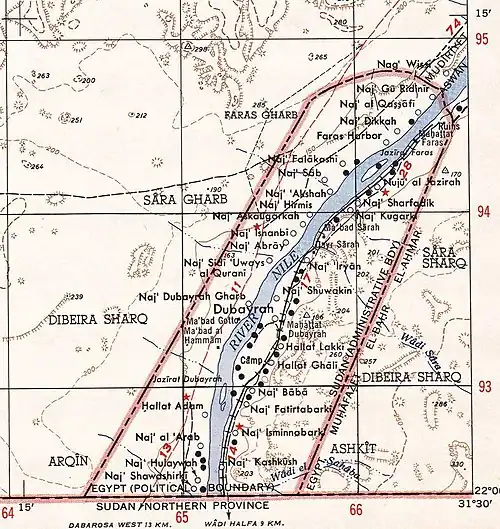 After a detailed map of 1953, before the flooding, 52 villages could be counted in the area, of which 24 were west of the Nile River (17 with names on the map), and 29 east of the river (12 with names), and one unnamed village on the Faras Island in the river. The largest town and only one with a population exceeding 2000 was Dubayrah (Arabic: دبيرة).[2]