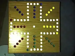 With 4 or 6 players: When 4 or 6 people are playing, there are two methods of play. One is partners. When playing partners, players opposite each other are partners. A player are not allowed to "take out" their partner by landing on their partner's marble, and they cannot pass their partner. When one partner gets all their marbles "home", they then use their turn(s) to help their partner get their marbles home. The partners assist each other only when one partner is finished. The first pair to get all their marbles "home" wins (regular rules apply). The other method is every man for himself, or "cut-throat". When playing cut-throat, there are no partners.