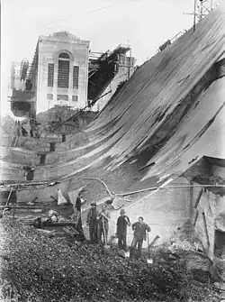 Finalisation work on the dam continued through to July 1935 with sealing of the temporary sluice gates and removal of most of the framework supporting the earlier construction of the dam.[44] The final damaged sluice gates would not be finally sealed off until 18 September 1936 when the water levels were low enough to ensure the sluices could be completely blocked.[45]
