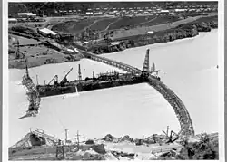 Dam construction began with a trellis bridge being erected across the river and completed in December 1928.[3]: 18 This enabled the construction of several cofferdams so that the foundations of the dam could be excavated and concrete subsequently poured. The construction of the first cofferdam was a narrow dam section in the centre of the river. This was followed by the cofferdam on the Canterbury (north) side of the river and restricted the Waitaki's flow by about half leading to half of the trellis bridge being swept away during a flood in early 1929.[3]: 18 The trellis bridge was repaired allowing the construction of eleven temporary sluice gates to control river flow during construction of the remainder of the dam.