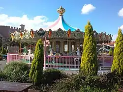 At the time Porto Europa was completed, the area immediately behind the site and across the canal, was empty. During the grand opening, the Japan Expo was held on this site for 72 days.[23][24] The owner has since installed a non-themed ride park, which is often confused with Porto Europa proper. This newer area has more in common with an American state fair and carnival than a theme park. This area features iron rides, including two coasters, merry-go-rounds, water slides, and a Ferris wheel. The coasters are Round and Round (Meisho) and Pinestar (Vekoma).[25]