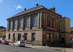 The building is two storeys high and five bays wide. It is built of sandstone, with rustication on the ground floor; the roof is covered in Welsh slate. The upper floors feature Ionic order pilasters, sash windows, and above them a frieze in which is inscribed "MECHANICS' INSTITUTION". The rear elevation is stuccoed and includes windows to the basement. There are wrought iron railings, with some finials in the form of urns.[2]