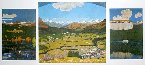 A triptych entitled "The Flims Panorama" was commissioned by the hotel director in 1904 from Giovanni Giacometti and presented to the hotel to celebrate the opening of the casino-pavilion in 1904. However, on the occasion of the buildings's first major restoration the triptych was taken down it was subsequently hung in the pavilion's entrance lobby for a period.