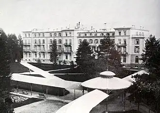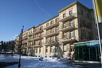 In 1904 the Jugendstil (Art nouveau) "casino" was built[4] as an entertainment venue. All the buildings were now connected to one another with covered walkways (replaced in the 1970s by tunnels which provide more convincing weather protection). By 1904 the spa complex offered more than 437 guest beds, and the enterprise was backed by 1.1 Million Swiss francs of share capital. The room rate was raised to 8.00 francs. The next year Eduard and Clara Bezzola, whose Romansch family name hints at their provenance on the other side of the canton took over at the Waldhaus from the Walthers. In 1908 the former "Post Hotel" was integrated into the complex and renamed as the "Bellavista" (today the "China Restaurant").