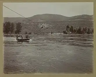 The irrigation system was the dominant factor for failure.[126] On the south shore, the creeks supplied water via 2 kilometres (1.2 mi) of wooden flume, 1.6 kilometres (1 mi) of ditch, 1.2 kilometres (0.7 mi) of wooden pipe, and 0.8 kilometres (0.5 mi) of steel pipe. On the north shore,[100] a similar combination stretched over 34 kilometres (21 mi).[127] An underwater pipe crossing the river to supplement the south shore irrigation was washed out two months after installation during the 1911 spring run off. The replacement was hung from a suspension bridge. When the pipe diameter was increased in 1914,[128] not only did the weight cause sag and leakage, but also prohibited use during high water. The total length of irrigation works was 102 kilometres (63 mi), which included the connecting lines to the orchards.[129]