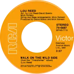 "Walk on the Wild Side" is a song by American rock musician Lou Reed from his second solo album, Transformer (1972). It was produced by David Bowie and Mick Ronson and released as a double A-side with "Perfect Day".[4] Known as a counterculture anthem,[5] the song received heavy radio play[6] and became Reed's biggest hit[7][8] and signature song.[9] "Walk on the Wild Side" touched on topics considered taboo at the time it was released, including transgender people, drugs, male prostitution, and oral sex.[10]