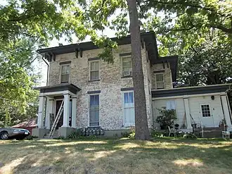 There are a number of Italianate houses such as this one in the Fulton Addition to the city of Davenport. Its vertical proportions and the millwork decoration on the eaves represents the post-Civil War expression of the style. The two-story brick house features a hipped roof, a three-bay front and an entrance that is left of center. The veranda on the south side has subsequently been enclosed. The porches have fluted posts with entablature. A bracketed cornice is just below the roofline. It also features a single molding strip at the base of the frieze that was a popular detail in mid-19th century Davenport.[2]
