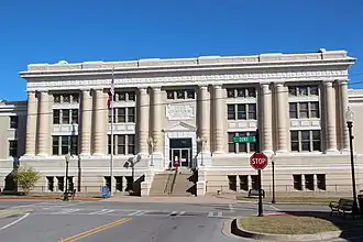 It was designed with Beaux-Arts architecture by architect Charles E. Bearden. It is a three-story, rectangular courthouse built of cream brick. It has multiple pairs of "colossal" Tuscan order columns running up the second and third stories, alternating with triple windows. Its entablature has triglyphs and metopes. It is described in its National Register nomination as having a Beaux Arts/Renaissance Revival design: "It is not a pure design but is adapted and is Renaissance Revival more in massing and long horizontal lines rather than specific details."[2]