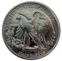 Art historian Cornelius Vermeule wrote that the Walking Liberty half dollar "really treat[s] the obverse and reverse as a surface sculptural ensemble. The 'Walking Liberty' design particularly gives the true feeling of breath and sculptural services on the scale of a coin."[28] Vermeule noted the resemblance of the half dollar to Roty's "Sower" but states that Weinman's piece "is an original creation, not a slavish copy".[28] On the reverse, Vermeule admired the eagle, which dominates but does not overwhelm the design, and stated that the bird's feathers are "a marvelous tour de force", showing the influence of Augustus Saint-Gaudens, under whom Weinman studied.[28] Vermeule characterized the Walking Liberty half dollar to be "one of the greatest coins of the United States—if not of the world".[28]
