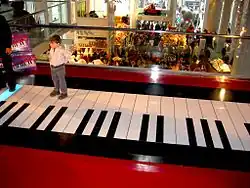 An early, one-octave version of the Walking Piano was installed at FAO Schwarz in New York City in 1982. A new three-octave version specifically created for the 1988 movie Big at the request of director Penny Marshall was played by Tom Hanks and Robert Loggia.[3][4][5] That piano was housed in the Please Touch Museum in Philadelphia, Pennsylvania until about 2013.[3][6] Another version of the piano was one made by Elliot Seth Newman, CEO and founder of Kids Station Toys.[7] This version was sold at select retail stores such as Target, Toys R Us, Walmart, and others. This version was sold as the, "Kids Station Toys: Step-On Piano." The product retailed for about $40 USD. Kids Station Toys made many other piano related toys that succeeded and successfully made millions, the top being the, "Fisher PriceTM Elephant Piano." [8]