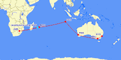 Qantas Empire Airways first flew the Wallaby Route to South Africa on 14 November 1948 with a survey flight operated with an Avro Lancastrian from Sydney via Melbourne, Perth, Cocos (Keeling) Islands, and Mauritius to Johannesburg.[4][5] Connecting the two continents with direct commercial air flight for the first time. The initial survey flight took a total of 41 hours and 52 minutes of flying time done over seven days of November 14–20. Combining a 10-hour 21 minute flight from Sydney to Perth, an 8-hour 5 minute flight to the Cocos Islands, a 12-hour 8 minute flight to Mauritius, and a final 9 hour 40 minute flight to Johannesburg.[1][4] The return eastbound route included an additional stop at Réunion due to the fuel & weight restrictions from the high altitude of Johannesburg.[1]