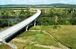 In 1929, an existing cane train bridge over the Burnett River was converted to be suitable for use by cars. As well as being convenient for local use, it also allowed those travelling between Brisbane and Rockhampton to bypass Bundaberg, which shortened the journey by 80 miles (130 km). It was funded by a local committee and was officially opened on 12 October 1929 by the Member for Burrum William Brand.[12][13] The bridge proved popular but soon the maintenance costs become too much for the local volunteers to fund so in 1934 they sought financial assistance from the local Isis Shire Council. However, as the other side of the Burnett River was in the Kolan Shire, the Isis Shire Council sought to spread the cost across both shires.[14] This lead in 1934 to a request to the Queensland Government to fund a new more permanent road bridge.[15] While the issue of funding remained unresolved, the lack of maintenance was taking its toll with the bridge and its approaches being described as "a bit of a nightmare" with recommendations to drive via Bundaberg instead.[16] The Queensland Government approved £11,825 for the construction of a new bridge in September 1938;[17] however, construction was delayed due to a shortage of steel.[18] The bridge was finally opened on Saturday 11 May 1940 by Harry Bruce, the Queensland Minister for Public Works, who outlined his vision for a highway from Coolangatta to Cooktown (of which the present day Bruce Highway from Brisbane to Cairns forms the major part). The new Wallaville bridge was a low-level concrete bridge 690 feet (210 m) long (25°05′07″S 151°59′42″E / 25.0853°S 151.9949°E / -25.0853; 151.9949 (Wallaville Bridge)).[19]