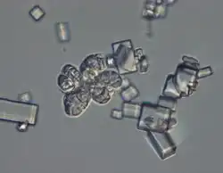 | Micrograph showing characteristic sarcina-like morphology of W. ichthyophaga and crystals of NaCl. | |