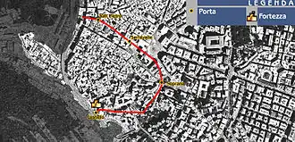 From the top of Mount Peralto, where Fort Sperone sits, walls come down towards the southwest in a straight line to Fort Begato, then continue to fall along the panoramic road which runs along the curtain walk, taking first the name "Walls of Granarolo" near the gate of the same name, then “Walls of Monte Moro”. After Fort Tenaglia, the walls continue as "Walls of Porta Murata" to reach the “Angeli Gate” and the “Walls of Angeli”, where nowadays they stop abruptly due to the excavation, in the 1930s, of San Benigno Hill, an imposing rocky ridge where formerly stood the church and monastery of San Benigno, later turned into barracks. The “walls of San Benigno” ran along the ridge of this hill and went to the lighthouse of Lanterna and the Lanterna Gate.