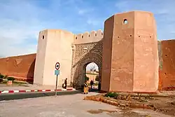 Dating to the Almoravid period, this was originally the northern gate of the city until Sultan Muhammad ibn Abdallah extended the city walls to encompass the northern neighbourhood of Sidi Bel Abbes in the 18th century.[1][2] The gate's name, Taghzout, is of unclear historical origin but is a common Berber toponym with a few different meanings; it may have referred to a nearby village or to the valley of the Tensift River.[3] The gate is also called Bab Sidi Bel Abbes (after the nearby shrine).[3] The gate resembled the nearby Bab el-Khemis in its original configuration: it was flanked by two square bastions and had a bent entrance by which one entered from the north and exited to the west.[2] Today, however, the gate has lost its bastions and its bent passage and all that remains is a large archway over the main street to the south of the Zawiya of Sidi Bel Abbes.[1][2]
