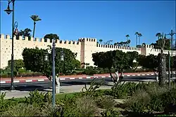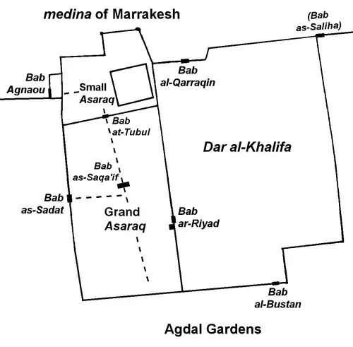 The main outline of the medina's walls today is still broadly that of the original Almoravid walls, although with notable differences to the north and south. The resulting walled area formed an irregular polygon of vaguely quadrangular shape.[2][1] Some of the irregularities in this outline may have been due to existing cemeteries and religious sites or to last-minute decisions to include more land within the walls.[1] Many of the city's main gates also date back to this period—at least in their locations if not necessarily in their current forms and names. These gates were, in clockwise order starting from the northeast: Bab Fes (later known as Bab el-Khemis), Bab Debbagh, Bab Aylan, Bab Aghmat, Bab Yintan, Bab as-Saliha, Bab Neffis (probably the predecessor of Bab er-Robb today), Bab ash-Shari'a, Bab al-Makhzen, Bab el-'Arissa (also known as Bab ar-Raha), Bab Doukkala, Bab Moussoufa, and Bab Taghzout.[3][1]: 118–128 [2] Four of these gates—Bab ash-Shari'a, Bab Moussoufa, Bab Yintan, and Bab as-Saliha—disappeared some time ago and are only known from historical texts or from vestigial physical evidence.[1][3]
