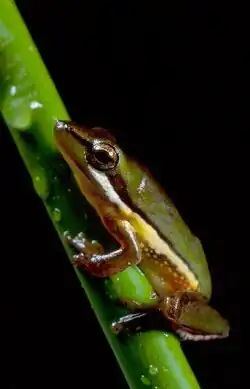 The wallum sedge frog (Litoria olongburensis), also known as the Olongburra frog or the sharp-snouted reed frog, is a species of frog that is endemic to Australia. Varying in color from brown to dark green it inhabits the thick and often acidic marshes of the Wallum along the coast of Queensland and New South Wales. Mating season comes in early spring, often after heavy rainfalls. Females attach their eggs to grasses and sedges. Their call is high pitched and follows a "creeeek... crik" pattern.