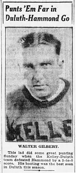 - ^ a b "Grid Tour Took Dodger Recruit to Many Parks: Wally Gilbert Was Backfield Man With Duluth Eskimos Under Nevers". St. Petersburg Times. Associated Press. August 10, 1928.