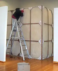 War Room is "a group of four eleven-by-eleven foot black canvases, each filling a wall of the room"[63] then arranged "into a square...in the shape of a room...and a door to go in it."[20] The installation has been described as a significant item of Bay Area art history.[64]