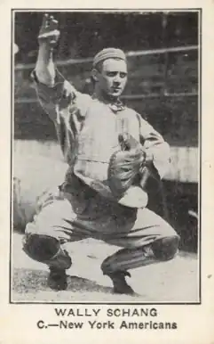 Walter Henry Schang (August 22, 1889 – March 6, 1965) was an American professional baseball player and manager.[1] He played in Major League Baseball as a catcher from 1913 to 1931 for the Philadelphia Athletics, Boston Red Sox, New York Yankees, St. Louis Browns and the Detroit Tigers. Schang was considered one of the best major league catchers of his era--offensively and defensively.[2]