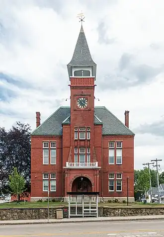 Walpole Town Hall is a historic town hall building at 972 Main Street in Walpole, Massachusetts, USA. The two-story brick building was designed by J. Williams Beal and completed in 1881. The building exhibits Classical Revival with Romanesque elements. Its most prominent feature is its 70-foot (21 m) square clock tower, topped by a pyramidal roof. The entrance is recessed at the base of the tower, under a large round-arch opening trimmed in brownstone.[2]