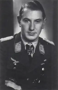 He was promoted to Major and took command of NJG 5 as Geschwaderkommodore (wing commander) on 15 March, succeeding Egmont Prinz zur Lippe-Weißenfeld.[5] He received the Knight's Cross of the Iron Cross (Ritterkreuz des Eisernen Kreuzes) on 27 July 1944 by which time he had achieved 45 aerial victories in total.[1]