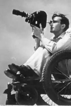 ![]() Walter Frentz filming the 1936 Summer Olympics for the film "Olympia" in Olympiastadion assisted by both Leni Riefenstahl and a crew. (See original picture below) | |