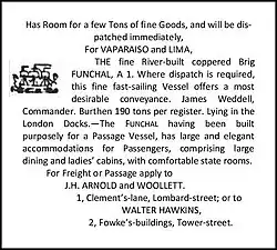 Hawkins advertised in newspapers from about 1818, usually in the Public Ledger and Daily Advertiser, to invite cargo and often passengers for ships sailing from London. They were typically coppered Brigs (120–220 tons) and usually destined for South America, including the Funchal which sailed for Valparaiso and Lima in 1827, under the command of James Weddell.