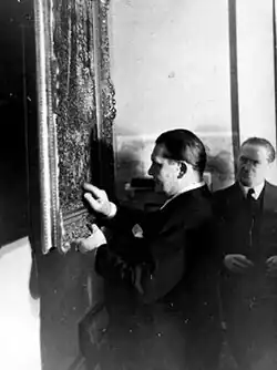 Hofer began to work for Hermann Göring in 1937 and became Göring's principal art agent and later director of the Göring Collection.[5] Hofer was not a member of the Nazi Party.[3] Hofer worked for Göring on a freelance basis, always maintaining his personal art dealing business and it was agreed between them that Hofer could keep any works he found for Göring that Göring refused.[6] With Göring's money and backing, Hofer could access collections anywhere in Germany.[7] He travelled on Göring's special art trains and could get essential foreign currency (Devisen) for his purchases which was in short supply for ordinary Germans. Where he didn't need foreign currency, as in the Netherlands where the German and Dutch currencies became directly convertible in April 1941, he was even more active in his acquisitions, sometimes competing with agents from other parts of the German government.[8] Göring said that the price of a work of art was never a problem and he often paid above market price (where he did not confiscate items outright) though he was often slow to pay the bill.[6] Hofer claimed that on one occasion in Paris, he beat an agent acting for Adolf Hitler to a Rembrandt by one day.[9]
