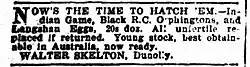 He was a breeder of fine poultry ‘who delights in the feather hobby’ – Indian Game, Black Orpingtons and Langshams.[8] Over the first decade of the 20th century Skelton entered many poultry competitions and either won his class or was well placed nearly every year from 1902 to 1910.[9][10][11][12][13][14][15] While he delighted in the hobby, it was also a business as he sold poultry and fertilised eggs.[16] The eggs had a warranty on their fertility or immediate replacement.[16]