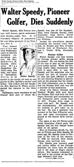 Walter and Nettie both took the lead in the fight for African-Americans to be able to play golf on Chicago's public courses. As early as 1910, Walter Speedy and three other black golfers hired a lawyer to defend them from the people who would not let them play in the Chicago city golf tournament at Jackson Park.[3]