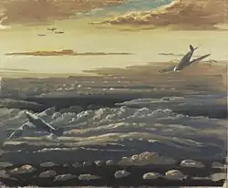 In May 1939, Monnington joined the Directorate of Camouflage at Leamington Spa where he worked on camouflage designs for airfields and factories. He also, after a chance meeting with Barnes Wallis, contributed design improvements, now in the Victoria & Albert Museum, to a new heavy bomber aircraft then being developed which later became the Avro Lancaster.[5] In 1943 Monnington, who had taken flying lessons before the war, wrote to the War Artists' Advisory Committee, WAAC, complaining of the lack of an aerial perspective among the works WAAC had so far commissioned.[6][5] In November 1943, WAAC issued Monnington with the first of a series of full-time commissions that saw him flying with a training squadron in Yorkshire and with Mitchell bombers to Germany. The winter of 1944-1945 was spent in the Netherlands amongst the Second Tactical Air Force drawing mobile radar and radio units.[1] The paintings Monnington produced of aerial warfare,[7] and especially those such as Fighter Affiliation.[8] from a perspective inside the aircraft, were to be among the most important such images in the WAAC collection.[6][9]