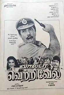 Walter Vetrivel is a 1993 Indian Tamil-language action film written and directed by P. Vasu. The film stars Sathyaraj, Sukanya and Ranjitha, with Vijayakumar, Goundamani, Nassar, Gandhimathi, Mohan Raj and Raj Chander in supporting roles. It revolves around a disciplined police officer who turns against his brother who has turned to crime.