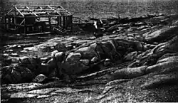 On 5 August, he sent Baldwin and three Norwegians to establish an advance camp further north, preferably at Cape Fligely.[9] With inadequate equipment and untrained dogs, the party made very slow progress, hauling and rowing much of the equipment by hand.[10] They eventually reached Cape Heller on Wilczek Land where Baldwin had the Norwegians construct a hut he named "Fort McKinley". On 22 October Baldwin left Bjørvig and Bentsen for the winter to guard their northern outpost with minimal supplies. They were left with no medicine, were to use no fuel for heating and consume no food other than walrus and polar bears. Bentsen soon fell ill and became delirious. He died on 2 January 1899. Bjørvig continued to share his sleeping bag with Bentsen's corpse throughout the winter so as not to attract polar bears.[11]