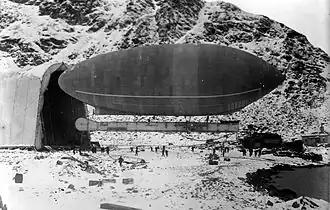 On December 31, 1905, Wellman announced he would make an attempt to reach the North Pole, but this time with an airship.[15] His newspaper provided funds of US$250,000,[15] and he had an airship built in Paris for the Wellman Chicago Record-Herald Polar Expedition. Wellman established expedition headquarters on Dane's Island, Svalbard, in the summer of 1906.[3] The hangar was not completed until August 1906, and the airship's engines self-destructed when tested.[16] Wellman rebuilt the airship in Paris that winter and attempted an aerial voyage to the North Pole in September, 1907. He made a second attempt without financial assistance in 1909, but mechanical failures forced him to turn back 60 miles (97 km) north of Svalbard.[3]