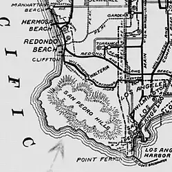 On July 21, 1874, a man named Ben S. Weston bought 3,000 acres (1,200 ha; 4.7 sq mi) acres of the old rancho for $5,250.[2][3] Weston's land included what is now Torrance Airport and was "bordered by what is now Madison on the west, Sepulveda Boulevard to the north, the Lomita line on the east, and the Palos Verdes foothills to the south."[2] According to a 1968 history of the settlement: