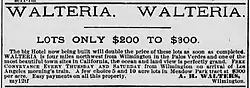 Walteria is named after Captain A. Richard Walters of Atkinson, Illinois.[4] Walters moved to the California farming area in the 1880s and built a stagecoach stop on the Redondo–Wilmington road connecting the salt works in Redondo Beach with the harbor in San Pedro.[5] In 1888, real estate developers advertised Walteria as a subdivision of Meadow Park that offered "pure air and delightful scenery" to potential buyers.[6] The name was apparently because "developers recognized the pleasing quality of the Spanish language. They named their subdivision either a truly Moorish Alhambra, a Spanish-sounding Moneta, or simply gave it a Spanish ending as in Walteria."[7] According to a 1949 history of Rancho Palos Verdes, "On the northern side of the ranch, abortive cities of grand scale [were] plotted, including the subdivision named Walteria on the property of [N. A.] Narbonne and Weston. Attractive as the plans appeared, the construction of these works was not consummated before the collapse of the boom, so the ranch lands remained planted in grain and devoted to grazing of sheep, except for a few scattered sales in the different tracts, and the growing San Pedro town. Walteria is little more than a name on today's map."[3] One 1890 account described Walteria as one of 60 paper towns laid out in the Greater Los Angeles era in 1887–88 but not substantially built: "The plowshare has passed over their ruins, and barley grows in their deserted streets."[8]