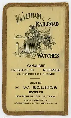 After the Civil War, the company became the main supplier of railroad chronometers to various railroads in North America and other countries.[11] In 1876, the company showed off the first automatic screw making machinery and was awarded the first gold medal in a watch precision contest at the Philadelphia Centennial Exposition.