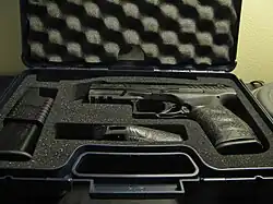 PPQ pistols are delivered in a polymer pistol case containing the pistol, three backstraps of different sizes, two magazines (one standard length and one extended grip length), magazine loader, safety cable lock, instruction manual, warranty papers, factory test target showing five shots fired at 15 m (16 yd) distance, and an envelope with the case of the proof round fired during the proof test at the C.I.P. accredited Beschussamt Ulm (Proof House Ulm).[9]