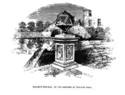 There is a sundial located on the island to the rear of Walton Hall. It was made by George Boulby in 1813 and is made out of an ashlar with copper gnomons.[7] It is a multi-faceted sundial made out of a polyhedron. It indicates the time in the following cities around the world: Amsterdam, Basel, Boston, Demerara, Madras, Madrid, Mexico City, Moscow, Beijing, Philadelphia, Rome, and Warsaw.[7] It was described by Richard Hobson: