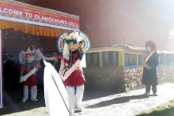 Walung people practice Nyingmapa Buddhism. A large monastery, Deki Chholing Gompa, was built 450 years ago sits on top of the main village of Olangchung Gola.[5] The chief deity at the monastery is Chenrezi (Avalokiteśvara).[4] The Walung people revere the monastery as their shelter from anything untoward. Historically, they would also invite Tibetan monks from Lhasa to provide teaching in this monastery.[4] Losar (Tibetan New Year) and Futuk are the main festivals, which the people celebrate with full pomp and show.[1] Losar celebrates the Tibetan New Year. Futuk reenacts a historical local battle.[3]