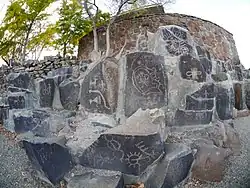 The Wanapum people are similar to the other native inhabitants of the Columbia River Plateau. The tribe made houses from tule and cut over 300 petroglyphs into the basalt cliffs.[1] In 1805, according to the journals of the Lewis and Clark Expedition, the Wanapum, led by their chief Cutssahnem, greeted the expedition and treated its members well, sharing food and entertainment.[3] Captain Clark’s journals provide descriptions of their dwellings, clothing, and physical characteristics.