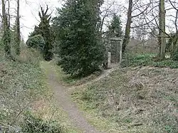 Wandlebury was a border settlement.[1] There is evidence that it was occupied by the Romans.[5] The Romans built a road from Worts Causeway to Wandlebury.[7] Two pottery sequences have been found establishing two separate construction phases.[8] It may have been inhabited into the 1st century AD.[8] It was later named Wendlesbiri (meaning, "Waendal's fort")[1] by the Anglo Saxons and used as a Hundred council rendezvous point. Sir Thomas Malory mentions a Wandesborow Castle in Le Morte d'Arthur (1470), possibly referring to the Wandlebury Ring.[9] The site has undergone considerable change since the 17th century.[10] When a house, garden and racing stable was built for King James II within the boundaries of the old fort in 1685, the inner rampart and ditch were levelled.[5] The mansion was later owned by Lord Godolphin and demolished in 1956, but the stable remains.[11] The site is now a country park.[2]
