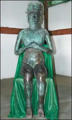 He promoted Buddhism as Goryeo's national religion, and laid claim to the northern parts of the Korean Peninsula and Manchuria, which he considered his rightful legacy as the successor of Goguryeo.[15] According to the Goryeosa, in 918, the ancient capital of Pyongyang had been in ruins for a long time and foreign barbarians were using the surrounding lands as hunting grounds and occasionally raiding the borders of Goryeo; therefore, in his first year as king, Wang Kŏn ordered his subjects to repopulate the ancient capital,[16] and soon sent his cousin Wang Sing-nyŏm to defend it. Afterward, he decreed Pyongyang as the Western Capital.[17] He also sought alliances and cooperation with local clans rather than trying to conquer and bring them under his direct control.