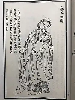Wang Meng (Chinese: 王猛; pinyin: Wáng Měng; 325 – August or September 375[1]), courtesy name Jinglüe (景略), formally Marquess Wu of Qinghe (清河武侯), was a Chinese military general and politician. He served as a chancellor of the Former Qin dynasty of China and under the Emperor Xuanzhao in the fourth century AD. Under his governance, the Former Qin expanded from encompassing only most of Shaanxi, eastern Gansu, and extreme western Shanxi and Henan, to covering nearly all of then-Chinese territory north of the Huai River and the southwest. He is commonly regarded as one of the greatest statesmen in Chinese history. Wang Meng is depicted in the Wu Shuang Pu (無雙譜, Table of Peerless Heroes) by Jin Guliang.