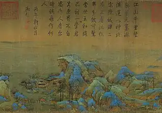 The scroll was done in the blue-green landscape technique of the Sui and Tang dynasties,[5] using azurite and malachite colours.[8] Zhan Ziqian of Sui, Li Sixun and Li Zhaodao, Zhang Zao, and Wang Wei of Tang are famous painters who worked in this genre. In the time of Emperor Huizong, blue-green paintings became a medium used to "express literary ideals".[8] Wang Ximeng apparently "boldly blended the north and south style" in his work.[10] With time the silk became darker, but colours are still bright.[10] Patricia Buckley Ebrey writes about Wang's style that the choice of blue and green colours can be seen as "a gesture of respect for the past"; besides colours, he borrows other Tang dynasty features - carefully drawn lines, and "perhaps the decision to feature people traveling through the landscape on foot, on horse back, and in boats". She notes that his compositional methods are "entirely" Song: "mountains and trees are not outlined, the hills are volumetric, and the lighting effects are dramatic".[6] Yuan dynasty Grand Secretariat Pu Guang wrote that the scroll is "a unique piece over a thousand years, comparable to the lone moon in a sky of stars".[8]