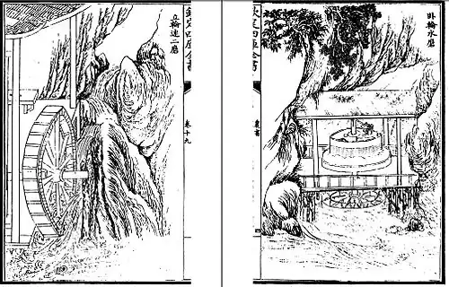 Amongst the various contemporary agricultural practices mentioned in the Nong Shu, Wang listed and described the use of ploughing, sowing, irrigation, cultivation of mulberries, etc.[3] It listed and described many of the various foodstuffs and products of the many regions of China.[3] The book outlined the use of not only agricultural tools, but food-processing, irrigation equipment, different types of fields, ceremonial vessels, various types of grain storage, carts, boats, mechanical devices, and textile machinery used in many applications.[3] For example, one of the many devices described and illustrated in drawing is a large mechanical milling plant operated by the motive power of oxen, with an enormous rotating geared wheel engaging the toothed gears of eight different mills surrounding it.[24] Of great interest to sinologist historians, Wang also outlined the difference between the agricultural technology of Northern China and that of Southern China.[25] The main characteristic of agricultural technology of the north was technical applications fit for predominantly dryland cultivation, while intensified irrigation cultivation was more suitable for southern China.[25] Furthermore, Wang used his treatise as a means to spread knowledge in support of certain agricultural practices or technologies found exclusively in either South or North that could benefit the other, if only they were more widely known, such as the southern hand-harrow used for weeding in the south, yet virtually unknown in the north.[26]