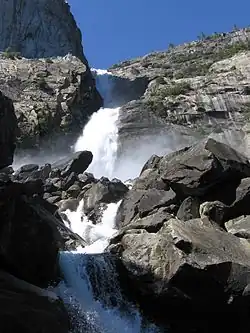 Wapama Falls is the larger of two waterfalls located on Falls Creek on the northern wall of Hetch Hetchy Valley below Hetch Hetchy Dome, in Yosemite National Park. The other waterfall, Tueeulala Falls, is on a separate seasonal distributary of Falls Creek. Wapama Falls flows year-round and during peak flow has been known to inundate the trail bridge crossing its base, making the falls impossible to pass. The falls consist of two primary drops angled roughly 60 degrees to each other, and a broad cascade at its base.
